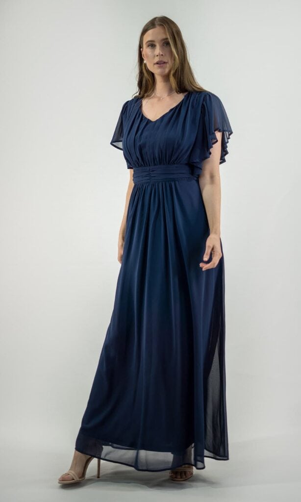 This full length gown is perfect for a formal occasion. It’s chiffon flutter sleeves are graceful. Pair with nude or silver accessories.