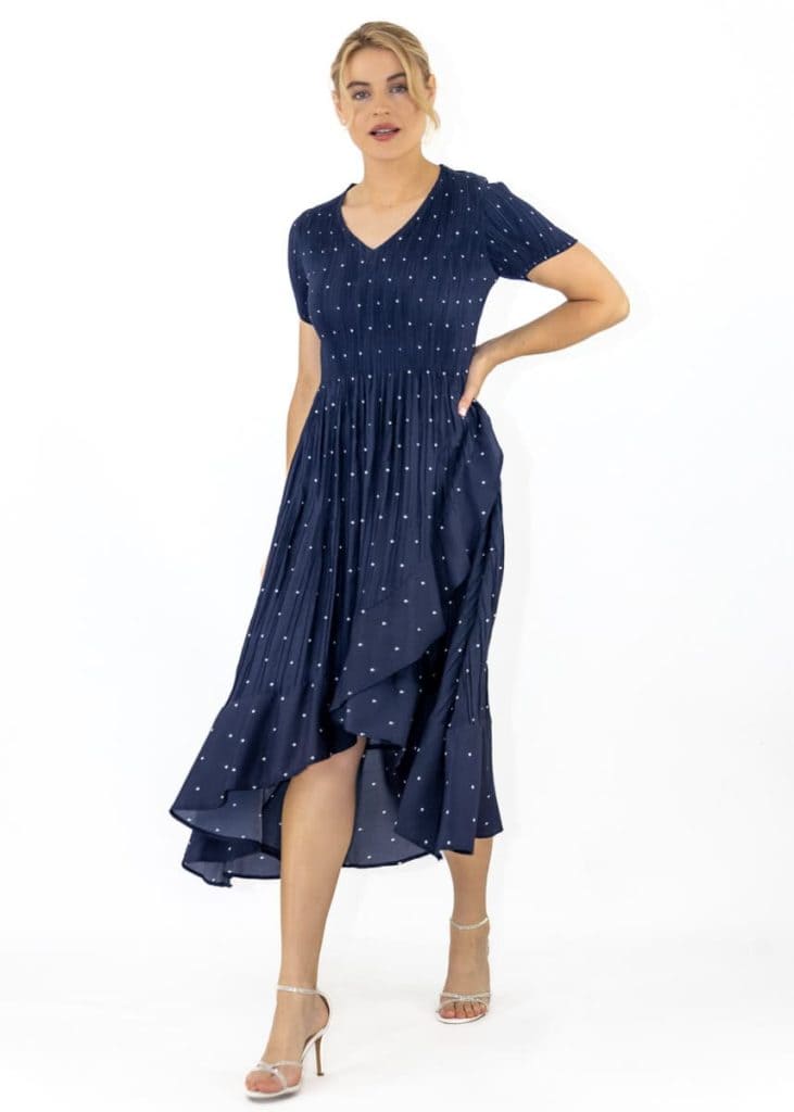 A fluid and flattering dress, both discreet, elegant, and full of charm. With a cut designed to enhance the silhouette. In deep navy blue, feminine V-neck, short sleeves, and fitted bust that gently flares towards the bottom for a fluid and elegant drape. A fluid and flattering dress, both discreet, elegant, and full of charm.