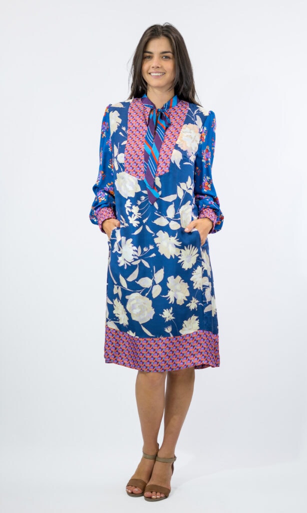 Floral Silk Tunic Dress, tie up neck detail & side pockets.
