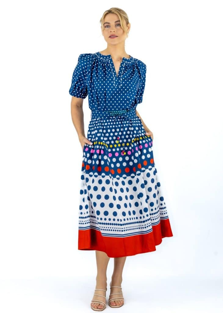 Crafted from multicolour printed cotton with zig-zag trims for contrast. Its fabric belt and practical pockets add function to this fun-loving silhouette.