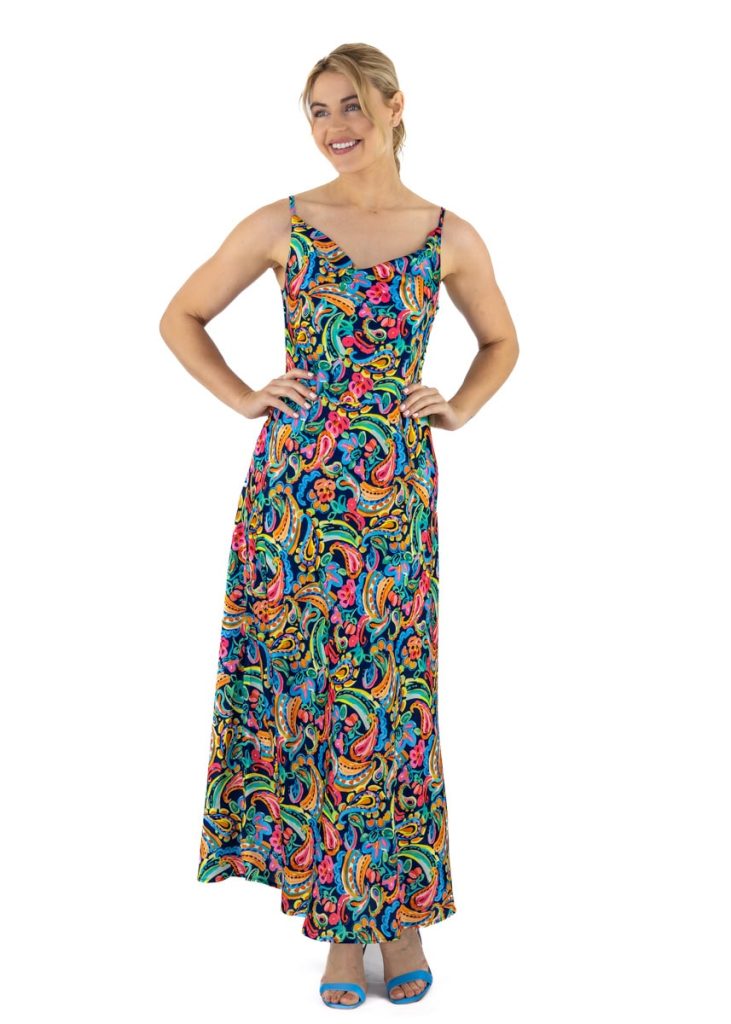 Made from lightweight and comfortable material, this dress offers an airy silhouette that naturally follows your movements. Its delicate bateau neckline and thin straps add a touch of femininity. Navy blue and white, with a multicolored design. Style with slides for a casual look, or elevate with heels and statement jewellery for an evening event.