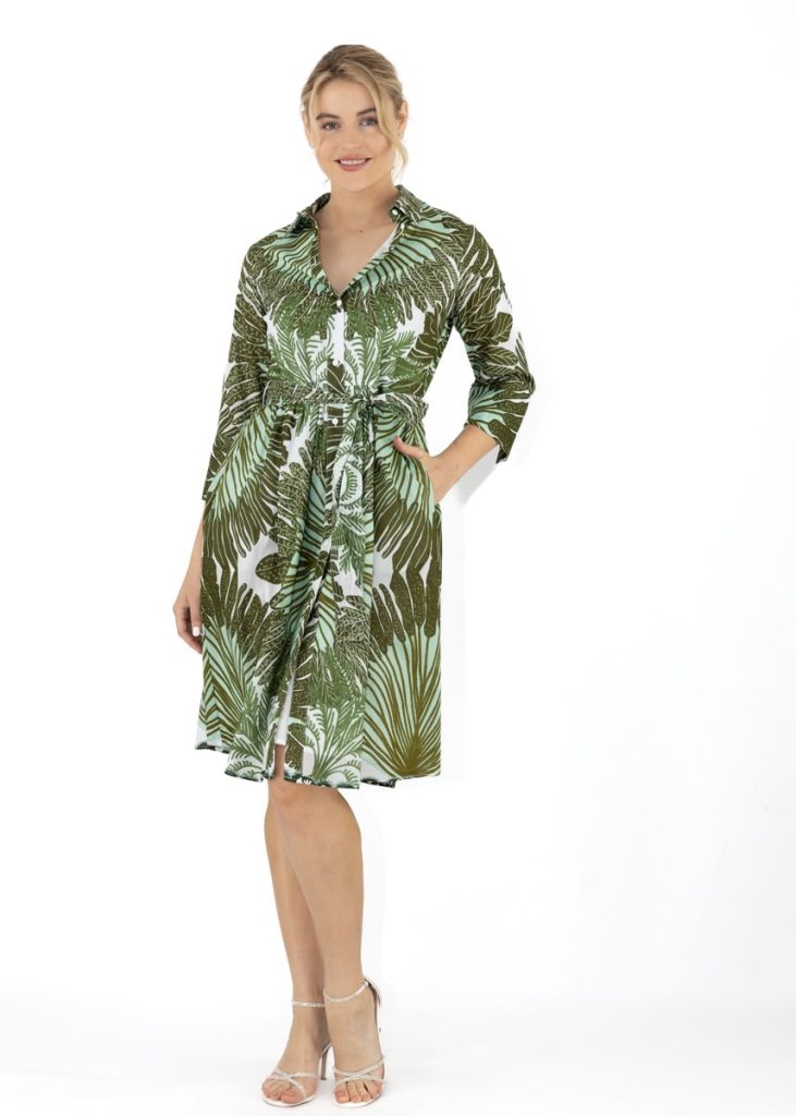 Designed for relaxed structure and everyday ease, a utility inspired dress crafted from soft organic cotton in a palm print. Featuring roll-up sleeves, a tie belt to define the waist, and side pockets for function on the go, its a perfect balance of practicality and style, made for wherever the day takes you.
