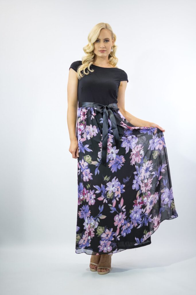 The Mavis dress offers both style and comfort! A jersey bodice and purple floral skirt that dances in the wind.