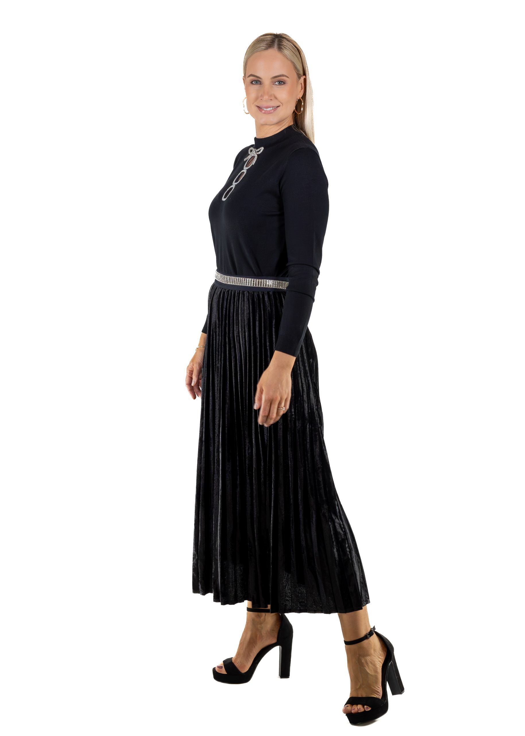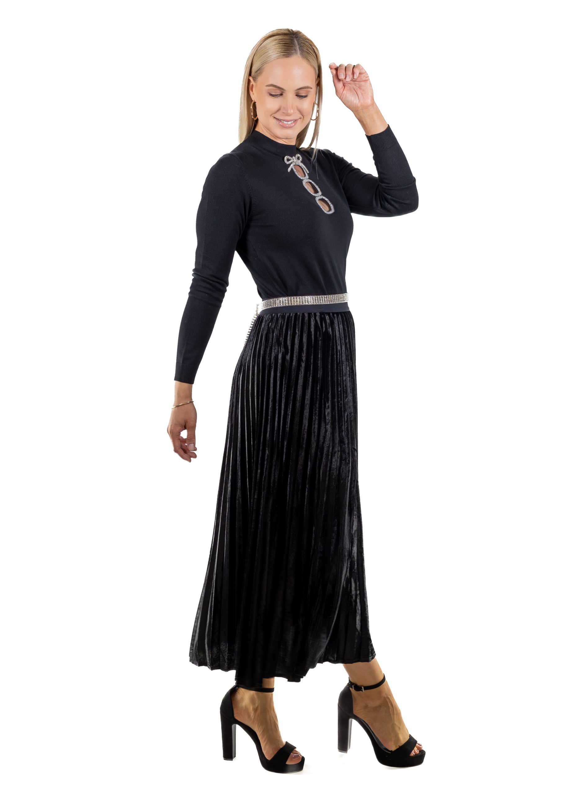 A sophisticated evening look that balances softness with sparkle. Subtle shimmer and fluid movement create quiet drama with a modern edge.
