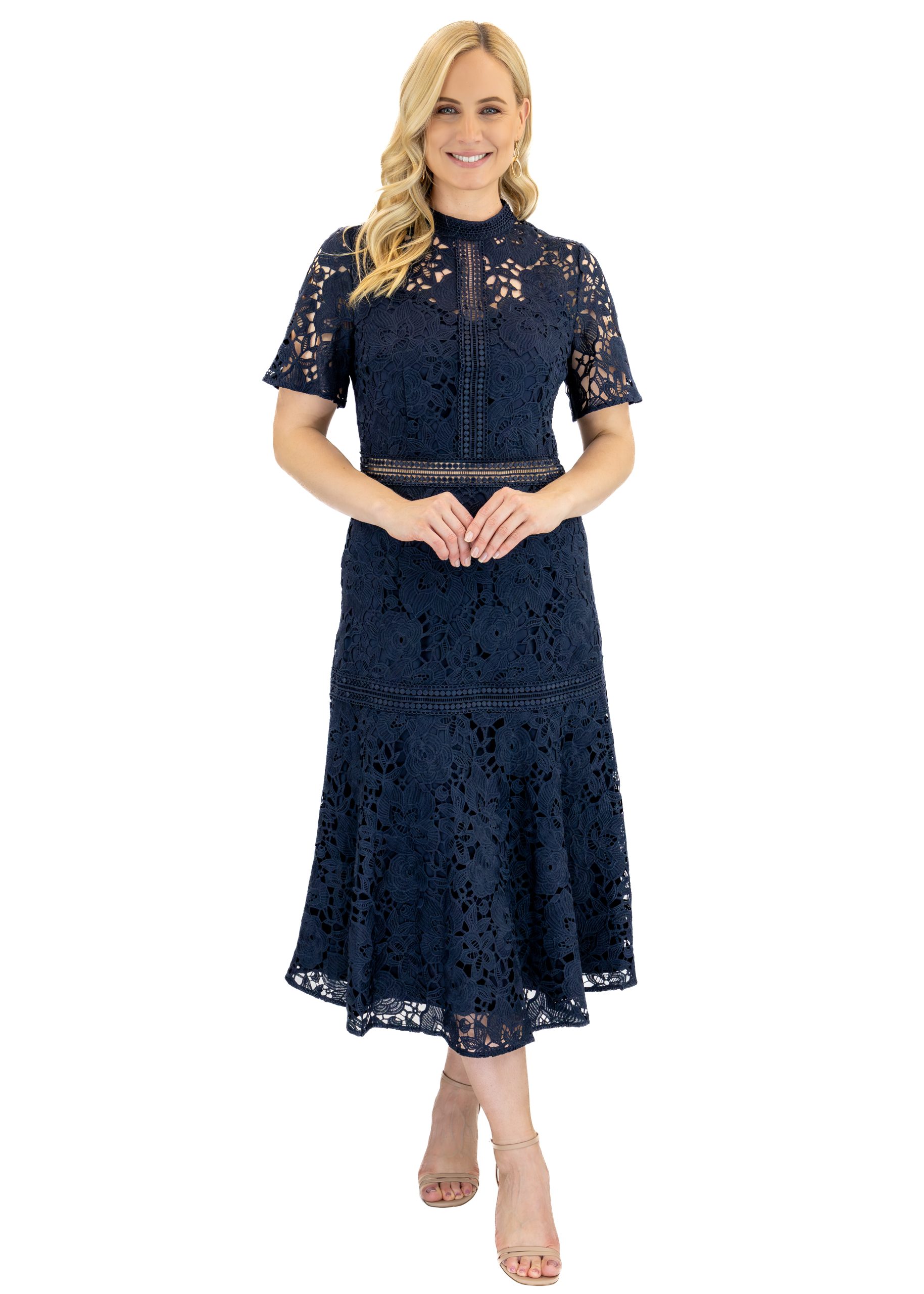 Elegant and refined, the Isabelle Dress in midnight blue is crafted from sculptural lace that creates depth and texture. The semi-sheer bodice features a heart-shaped lining for a subtle, feminine touch, while the skirt flares gently into a soft bell shape for graceful movement. Fully lined with a concealed back zipper, this midi-length design balances sophistication and allure.
