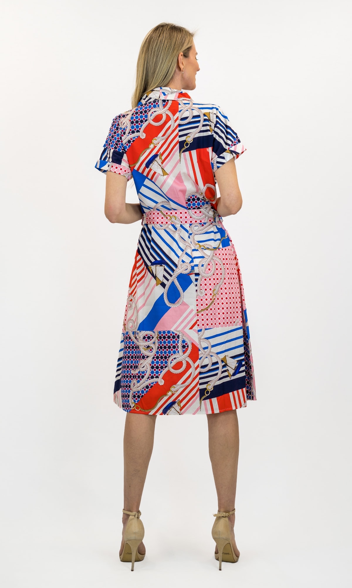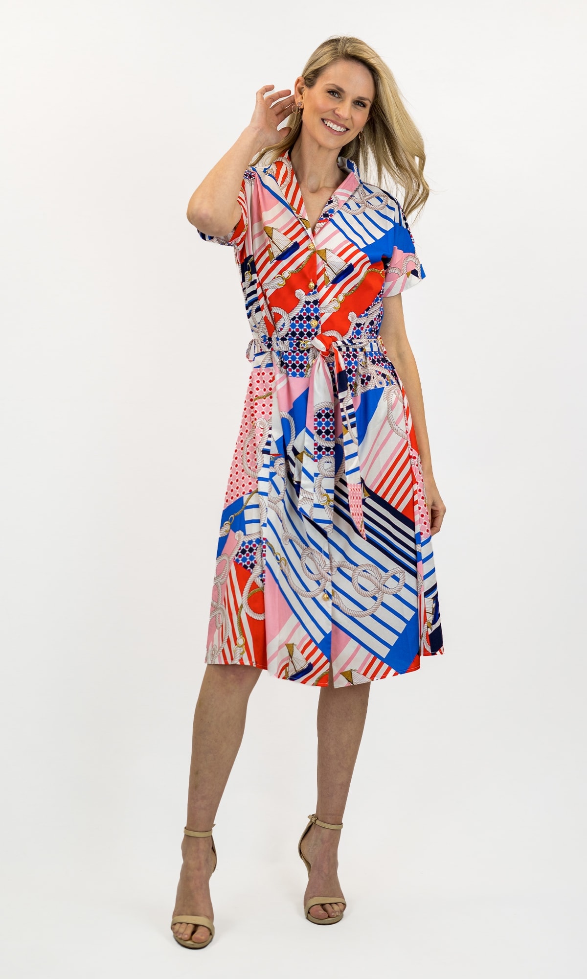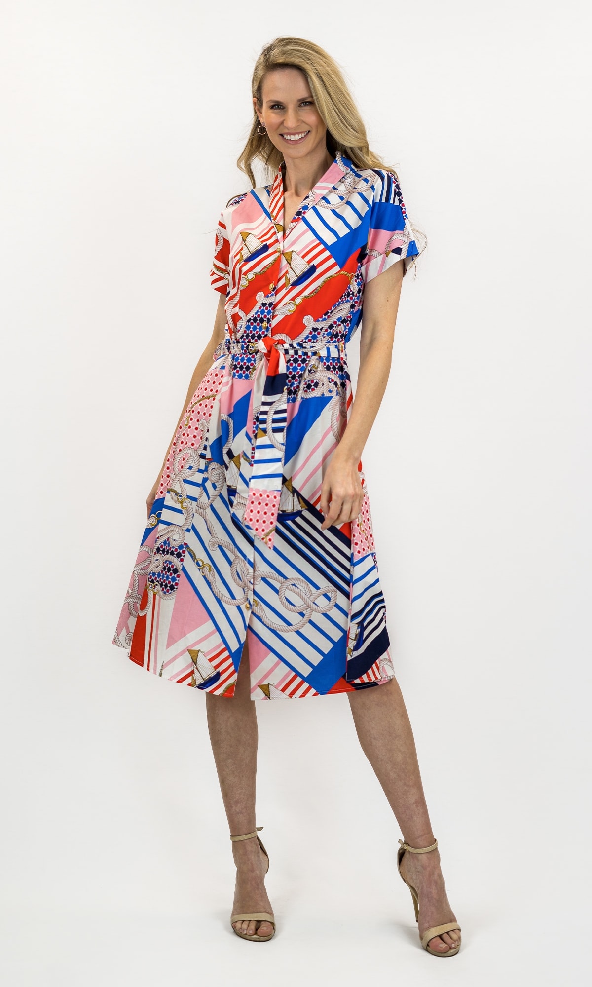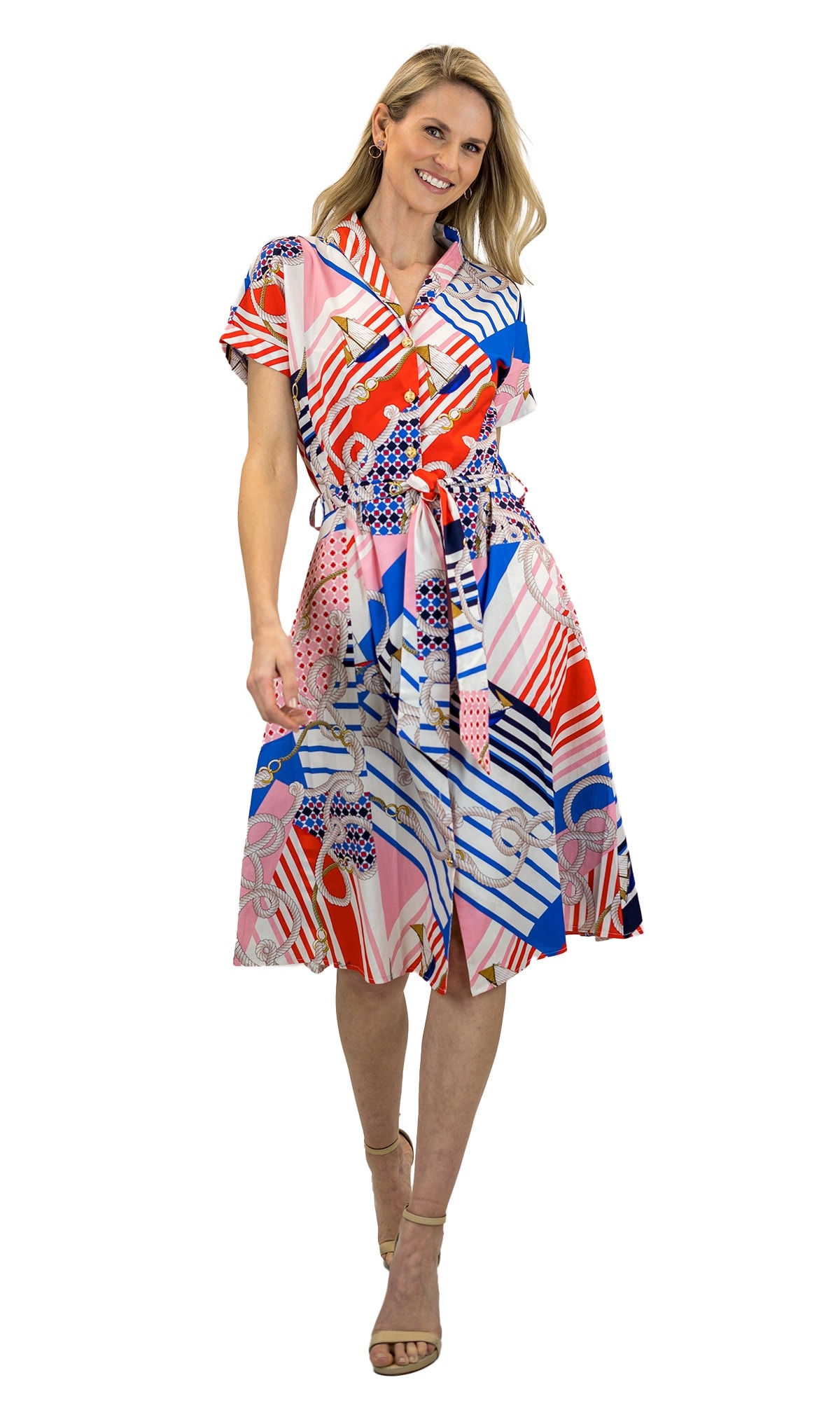 Elevate casual charm, with this easy, breezy Style. Effortless in its design, 100% cotton, button front, cuffed sleeves, tie waist.
