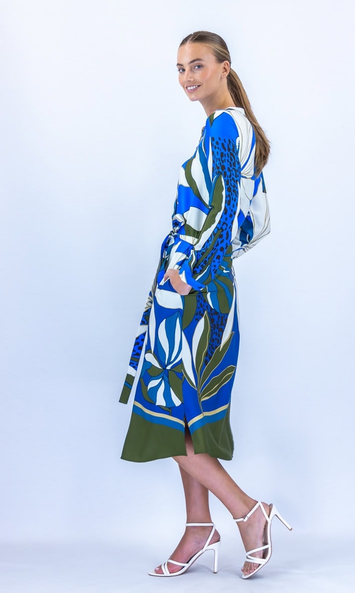 Round neck, long sleeves, button through, dress with big olive and blue print, side pockets and matching tie belt. A versatile piece that can be styled in countless wayspaired with sandals for a relaxed daytime look or dressed up with heels and jewelry for evening events.
