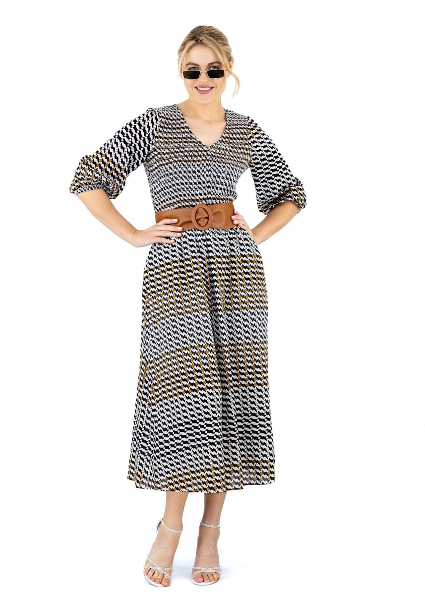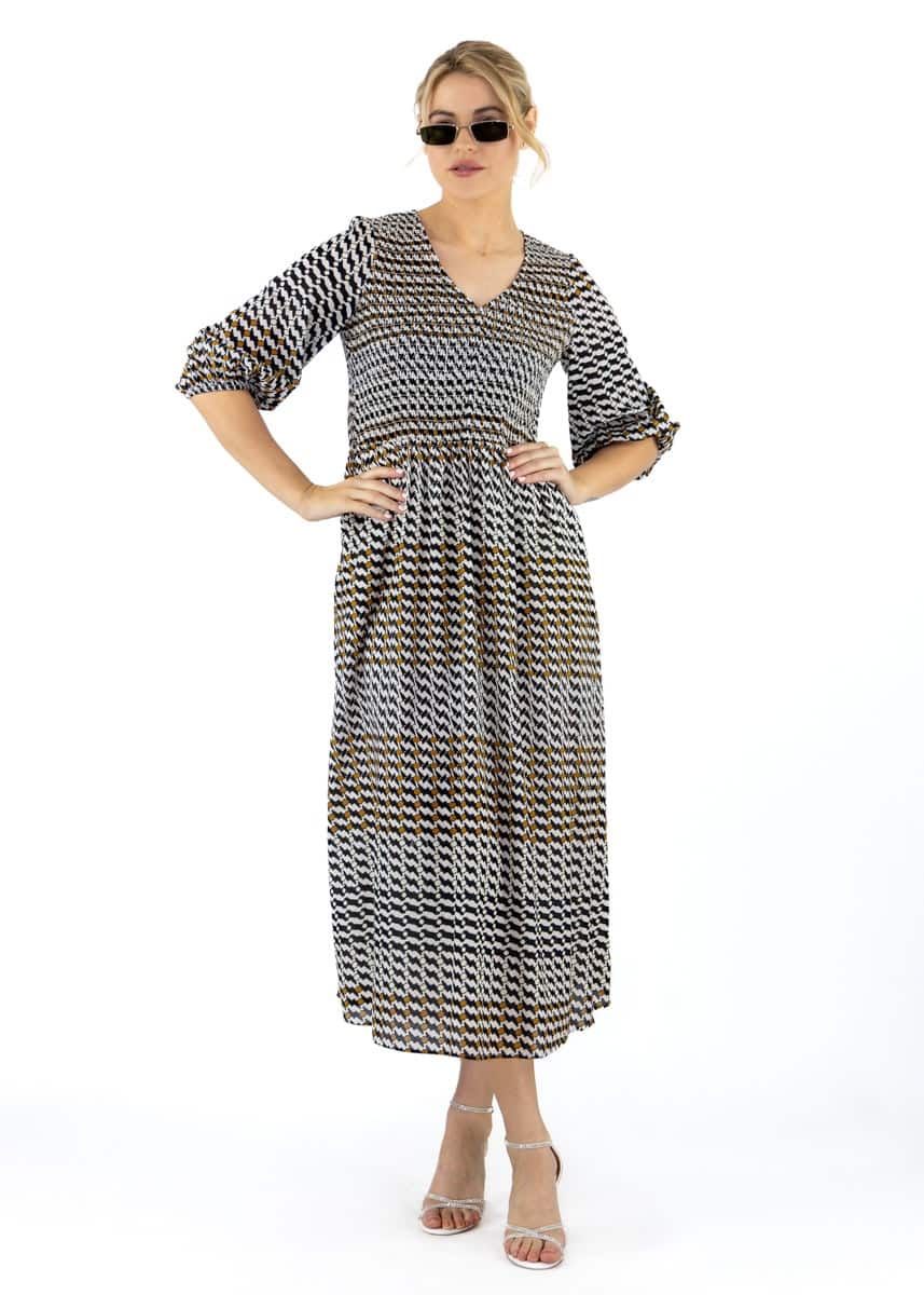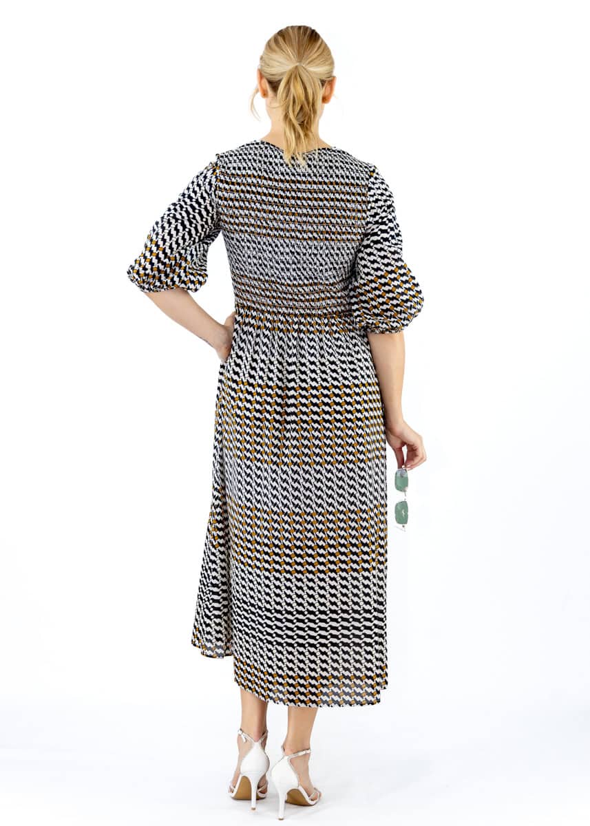 Soft, fluid, and effortlessly feminine, this dress is crafted in organic cotton with a gentle smoke effect print that moves with quiet drama. Long in length with a loose, floaty fit, it features subtle gathers that flatter and shape the silhouette without clinging. Designed with versatility in mind, it can be accessorised with or without a belt, offering many styling options to suit your occasion. An elegant blend of ease and artistry.