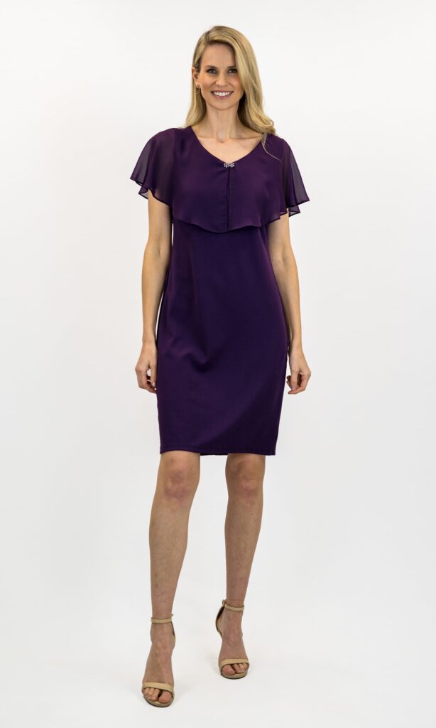 Suzie amethyst dress with tiered bodice. Pair with black or silver accessories.