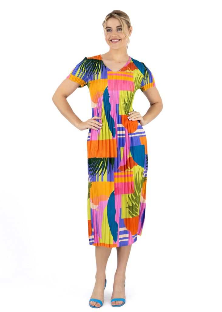 Parisian elegance meets tropical vibrance in this effortlessly chic dress. Featuring a striking tropical print and stretch pleat fabric, its the perfect choice for warm-weather occasions. Comfortable, lightweight, flattering for all body shapes and full of French flair.